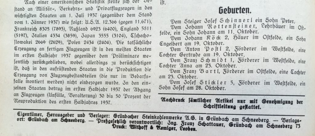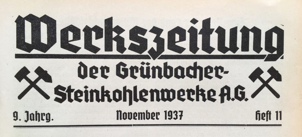 Werkszeitung der Grünbacher Steinkohlenwerke AG. 1929-1939. Besonders: 9. Jahrgang 1937 (Heft 11, November) und 10. Jahrgang 1938 (Heft 2, Feber). Grünbach am Schneeberg.