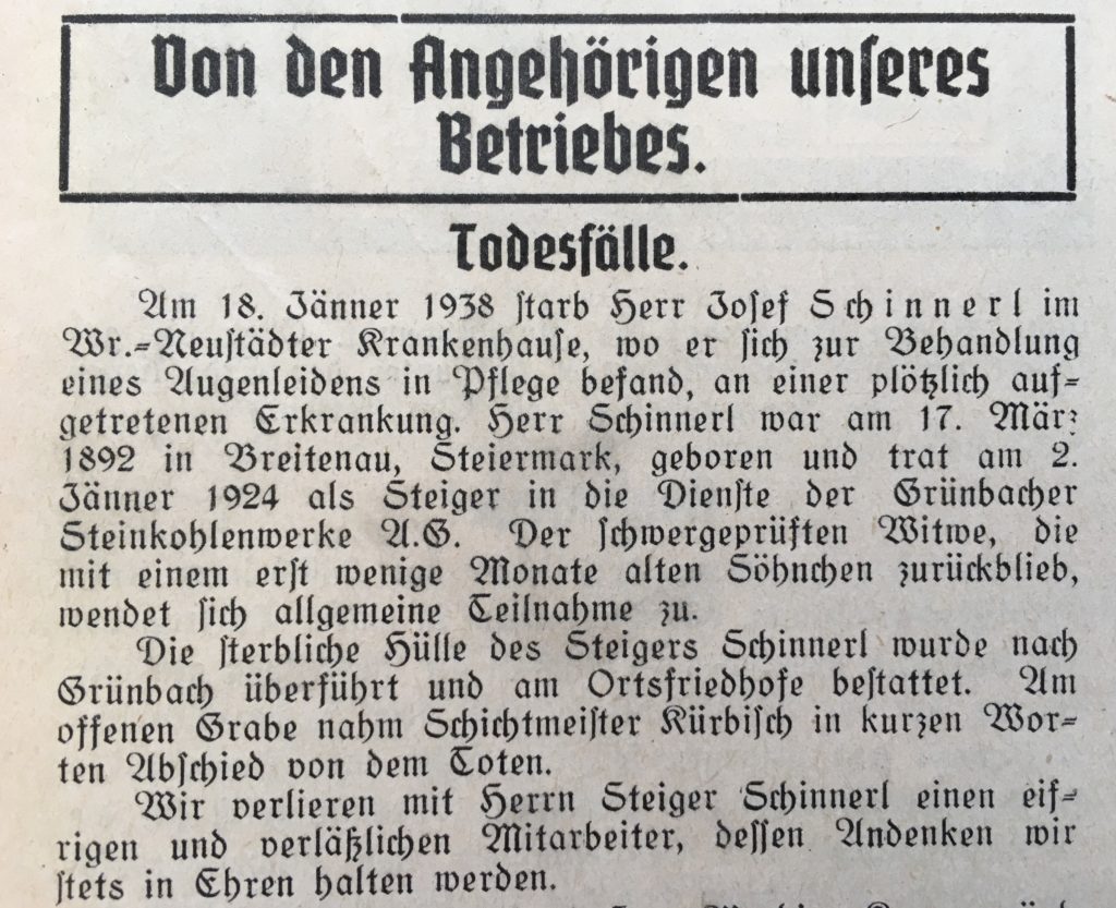 Doch bei einem Krankenhausaufenthalt Josef Schinnerls in Wiener Neustadt kommt es zu plötzlichen Komplikationen. Josef stirbt am 18. Jänner 1938.